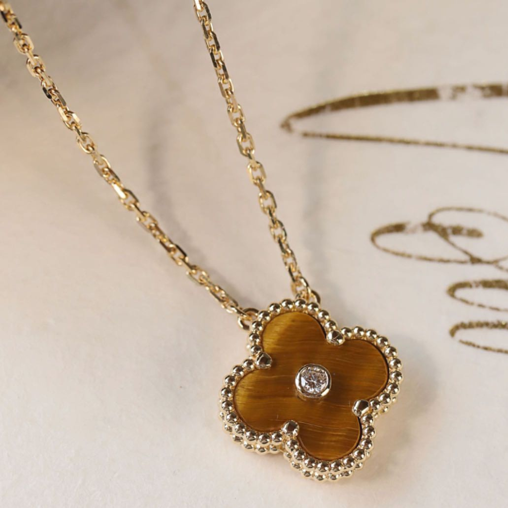 Ten elegancki naszyjnik ma piękny wisiorek w kształcie kwiatu z kamieniem tygrysiego oka, z błyszczącym, diamentowym akcentem w centrum. Złocony łańcuszek podkreśla luksusowy wygląd, tworząc idealną równowagę między odwagą a wyrafinowaniem. Kształt kwiatu dodaje delikatności i kobiecości, co czyni go idealnym na co dzień oraz na specjalne okazje. Ciepłe odcienie kamienia tygrysiego oka nadają mu unikalnego uroku. Uniwersalny naszyjnik, który podnosi każdą stylizację swoją wyrafinowaną elegancją.