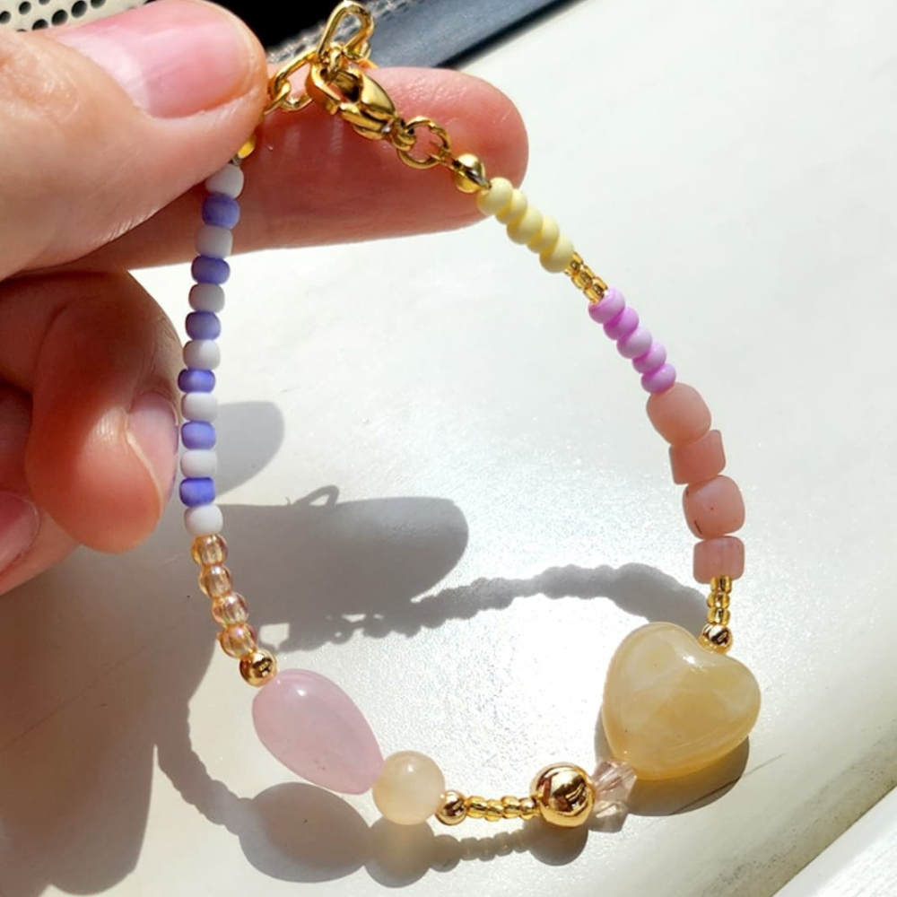 Ta bransoletka łączy pastelowe koraliki z uroczym serduszkiem jako głównym akcentem. Jej delikatne kolory nadają całości lekkiego i młodzieżowego charakteru. Złote detale dodają elegancji i subtelnego blasku. Idealnie sprawdzi się na co dzień, szczególnie w połączeniu z casualowymi stylizacjami. To subtelny dodatek, który dodaje słodyczy każdemu lookowi.